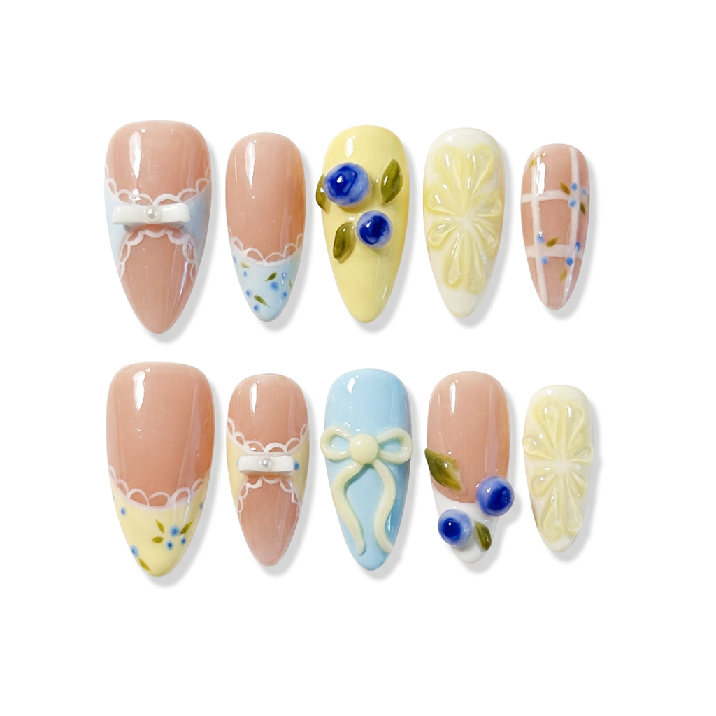 Finish: Glossy hand-painted finish – Nude base with bold blue French tips and vibrant fruit-floral illustrations