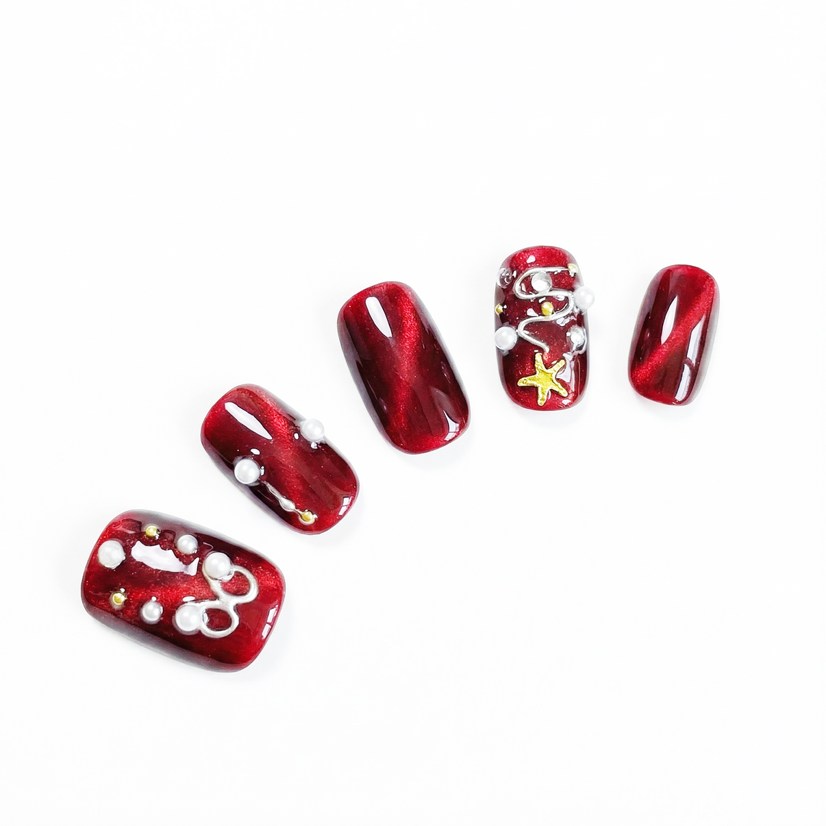 Deep red wine-inspired nails adorned with elegant pearl accents and a touch of metallic gold for festive sophistication. Skip the salon—apply these for instant holiday glamour, perfect for Christmas parties or cozy winter nights.
