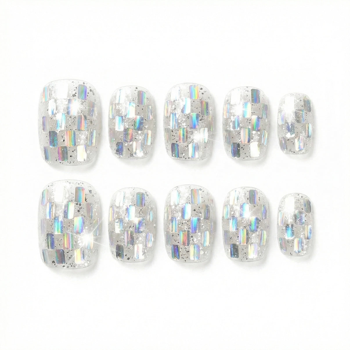 Finish: Glossy jet black + silver glitter gradient + Handcrafted silver filigree charms + clear crystal accents + pearl details – Ornate, gothic-inspired motifs including butterflies, crosses, and crowns for a luxurious, dark-romantic vibe