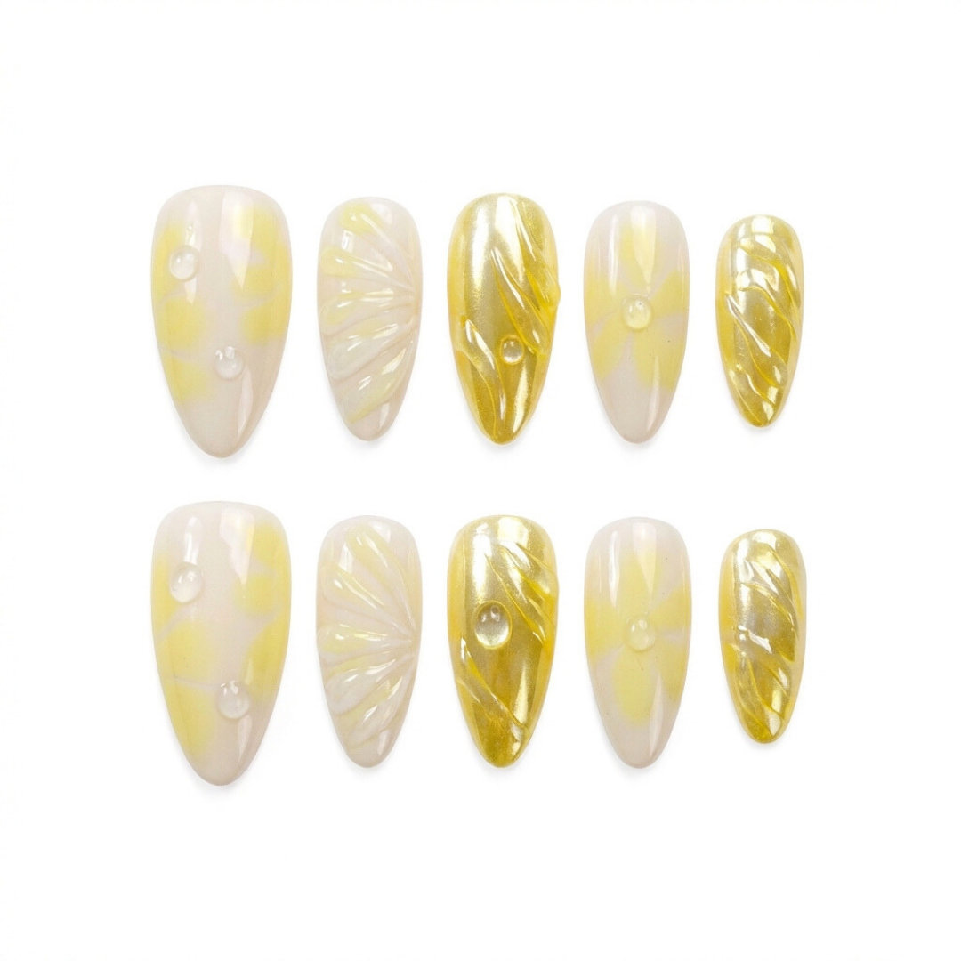 Opacity: Soft milky white base blended with buttery yellow, with full-coverage metallic gold sections