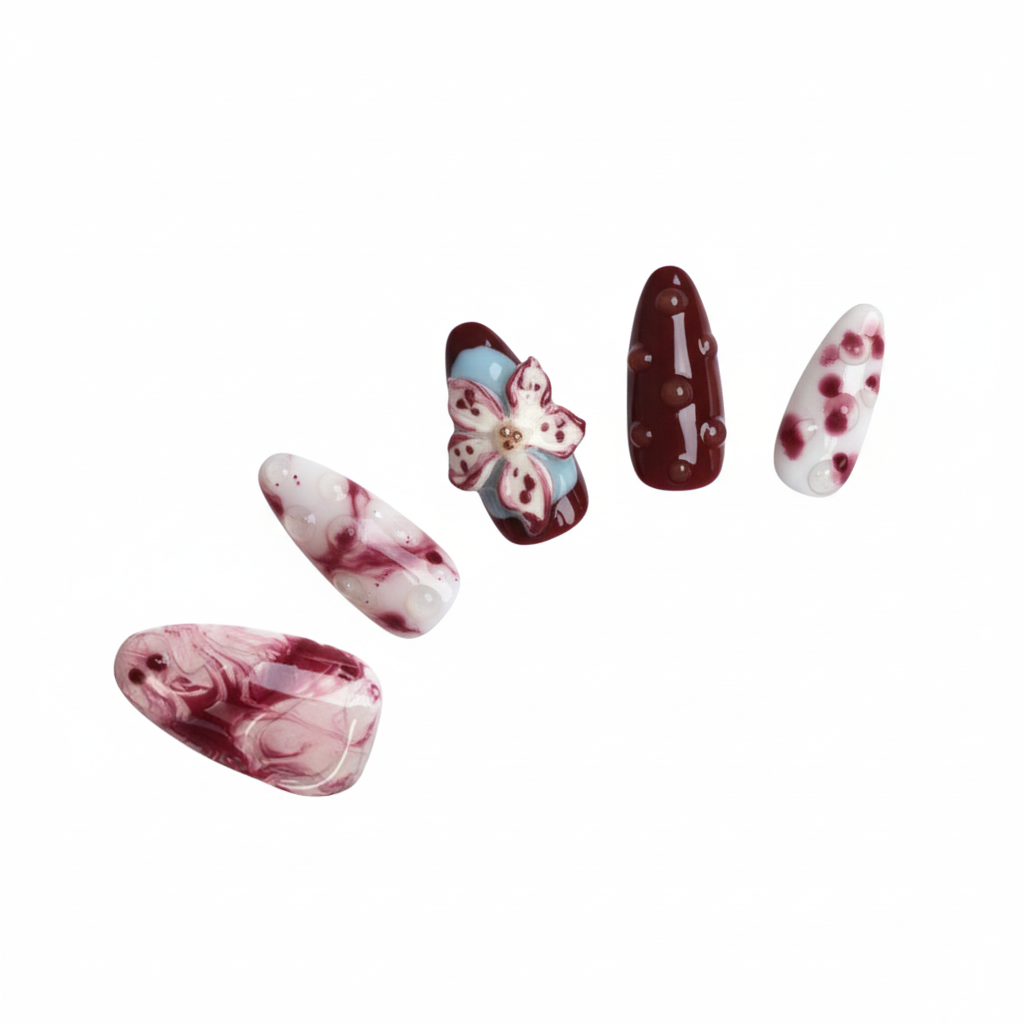 Soft color gradients, delicate hand-painted details, and textured 3D engraved flowers—blending elegance with dimension. The medium-long almond shape elongates fingers, while the rich tones brighten skin.