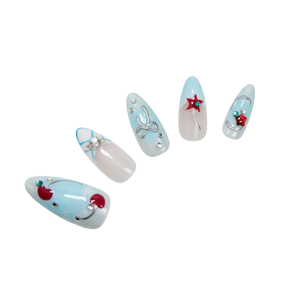 High-end blue combo—vibrant yet elegant, and designed to brighten skin tones. Adorned with delicate sky blue bowknot details, adding a cute, refined touch.