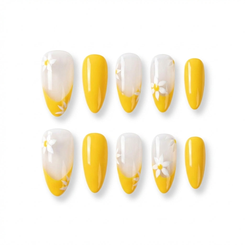 Finish: Bright yellow French tip + sheer nude base + hand-painted white daisy accents with sunny yellow centers – Fresh, floral radiance