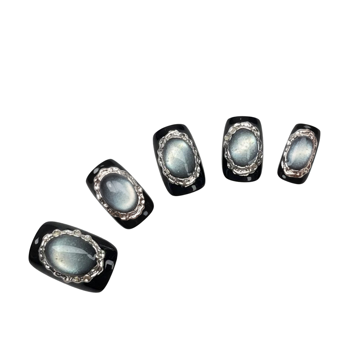 Edgy yet sleek—these dark short press-ons shine with silver mirror cat eye effects! The deep dark base contrasts sharply with the metallic silver cat eye sheen, shifting beautifully under light.