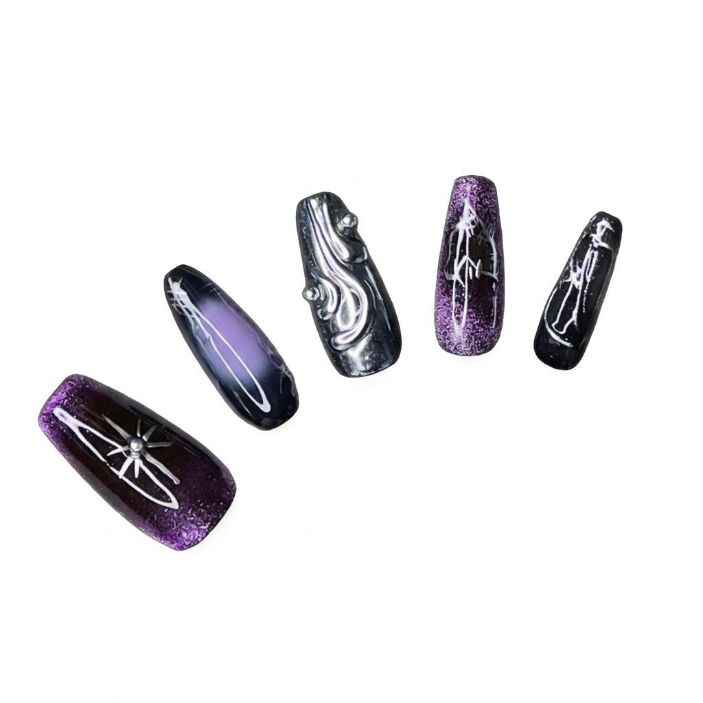 Finish: Rich berry cat eye base + hand-drawn graffiti accents + delicate belted grid lines – Soft, luminous shimmer